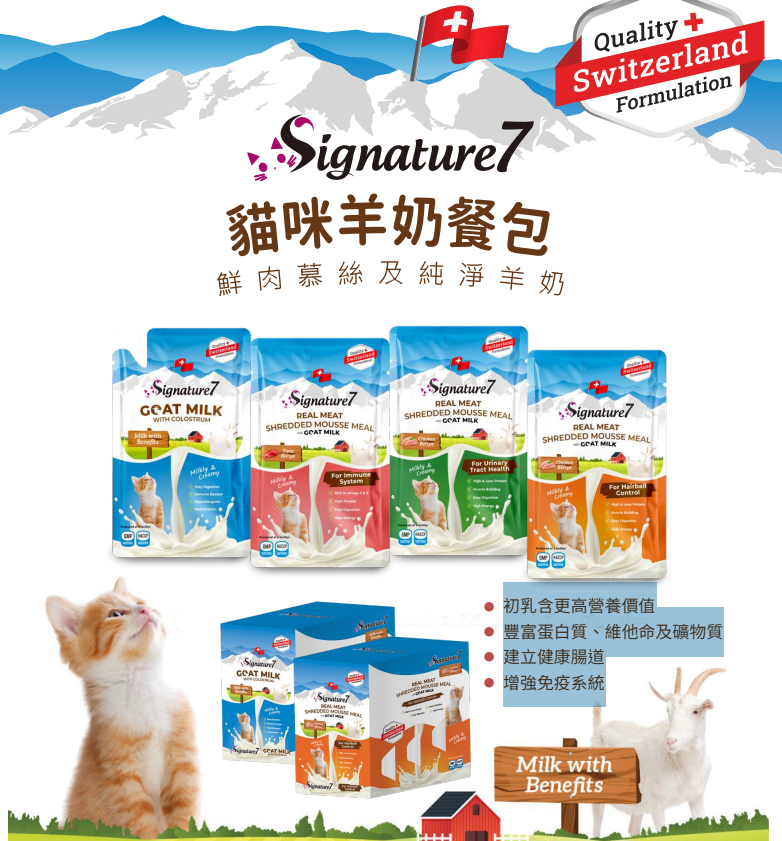 Signature7 推出創新的羊奶真肉慕斯餐和純羊奶系列,完美融合瑞士優質配方與羊奶的天然益處。這些產品專為貓咪精心打造,以慕斯形式呈現的真肉,有助於控制毛球、促進泌尿道健康並增強免疫系統。添加純羊奶可增強貓咪消化能力,並提供高蛋白質含量,有助於增強肌肉。我們的羊奶系列不含人工添加劑,專注於促進貓咪消化和保持最佳健康狀態。我們提供雞肉、鮪魚等多種口味,每袋都能為您的愛貓帶來愉悅健康的餵食體驗。