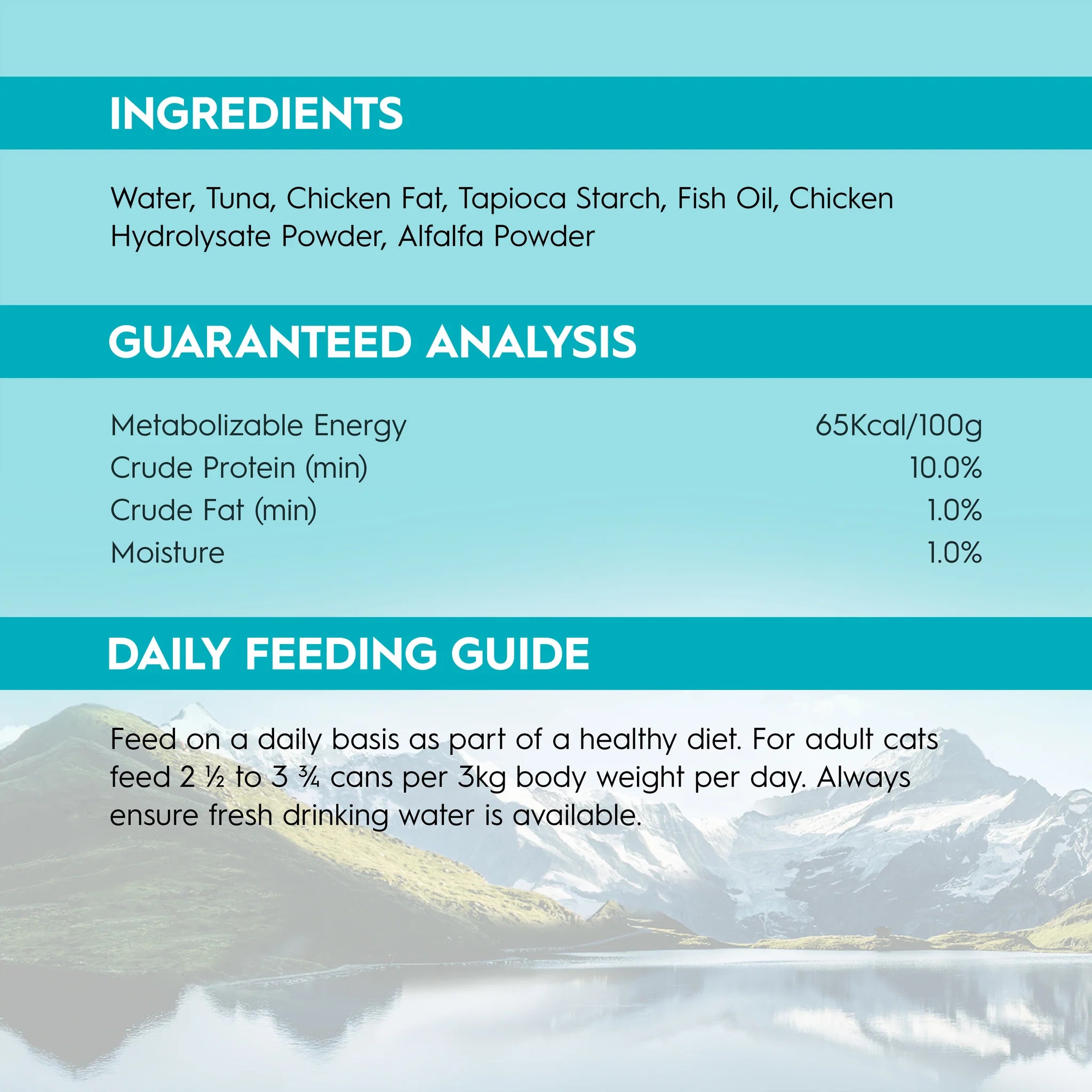 水、吞拿魚、增稠劑、雞脂肪、魚油、磷酸三鈣、雞肉水解粉、苜蓿粉、礦物質、氯化膽鹼、維生素、牛磺酸、硫酸鎂、單硝酸硫胺素、碘化鉀