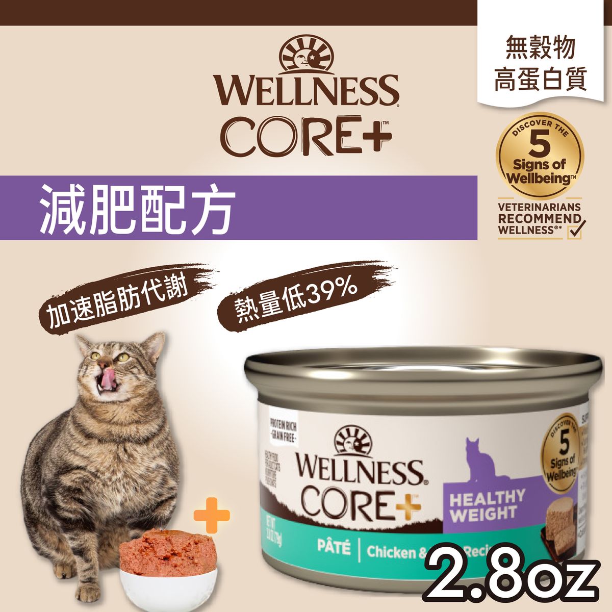 Wellness CORE+ 健康體重濕糧配方以高蛋白質和天然無穀物的營養設計,支持貓咪的全身健康與體重管理需求。每份濕糧均採用優質雞肉和吞拿魚作為主要成分,富含高品質蛋白,加入左旋肉鹼幫助健康脂肪代謝,促進理想體型。同時不含人工香料、防腐劑、色素及卡拉膠,為您的愛貓提供純淨、健康、安全的每日餐食。